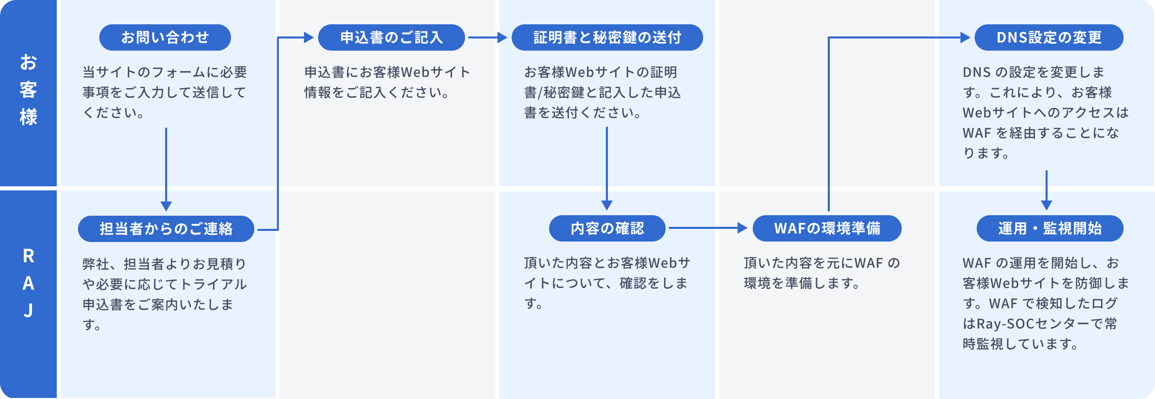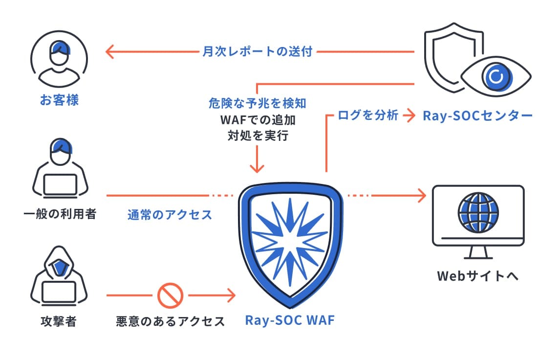 運用体制 | レイ・イージス・ジャパンの SOC チームが常に監視をします。危険な兆候を検出した場合、WAF での追加対処を行います。 監視状況ついては月次レポートをお客様にお送りします。 |